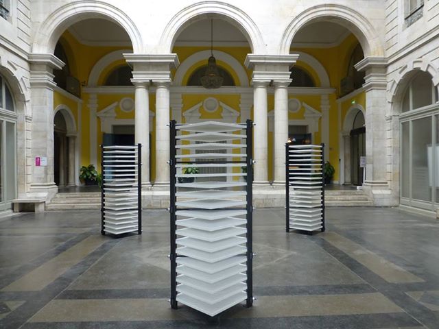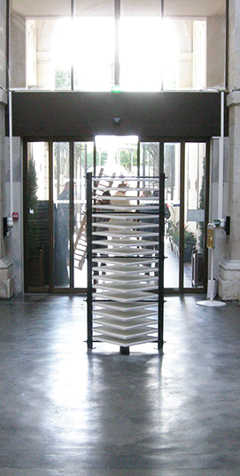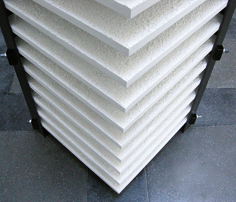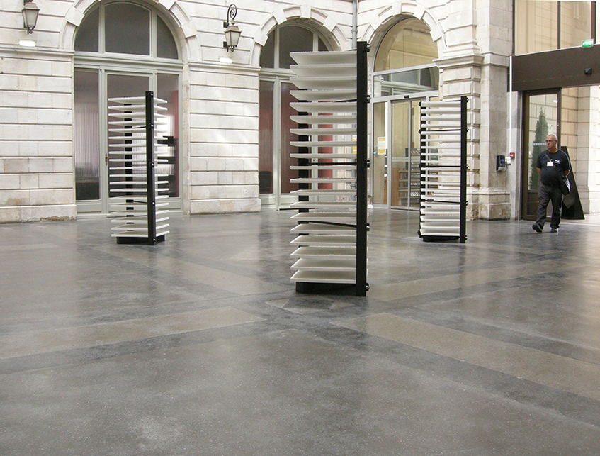 Des blocs ajourés se dressent à hauteur de regard. Pour chacun d’eux, deux cornières verticales soutiennent et prennent en tension de lourdes plaques blanches. Elles évoquent des racks, empilements de mémoires informatiques, des archives, des claies de feuilles de papier. On aperçoit leur surface crépie grossièrement dans les intervalles des rayonnages. L’enduit donne aux plaques des allures de maquettes : le regard s’aventure à l’intérieur de ces reliefs miniatures d’aspect lunaire. C’est comme l’inventaire d’un terrain en friche extensible à l’infini, d’espaces disponibles, d’un sol à occuper.