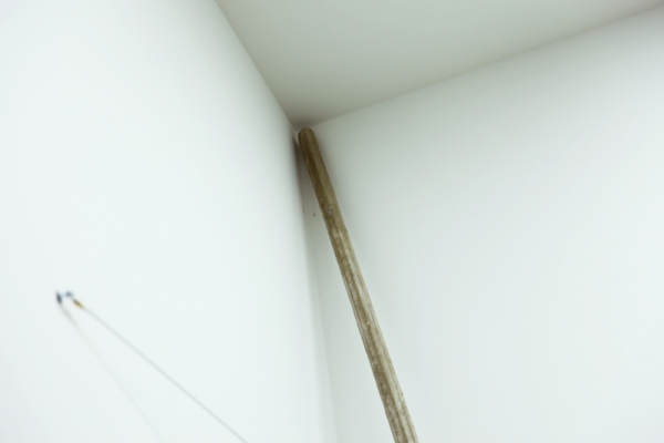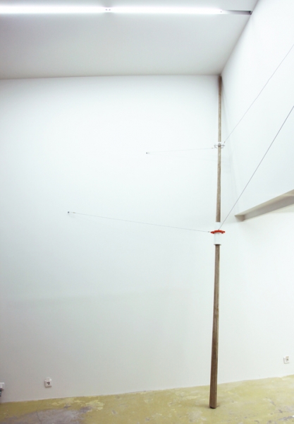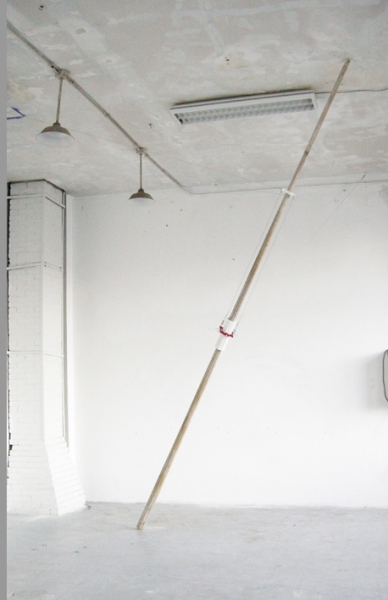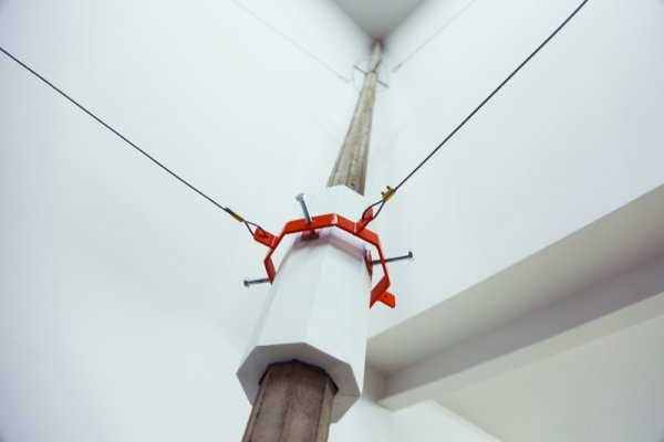 La sculpture « Plug-in rhizome » se présente comme une aiguille de béton, un mas esseulé qui tente de se soutenir et crée son propre réseau. Réalisée par assemblage de colonnes octogonales en béton, elle défie ce matériau et mêle une technique brutaliste de construction à un maniérisme dans son système d’accroche.