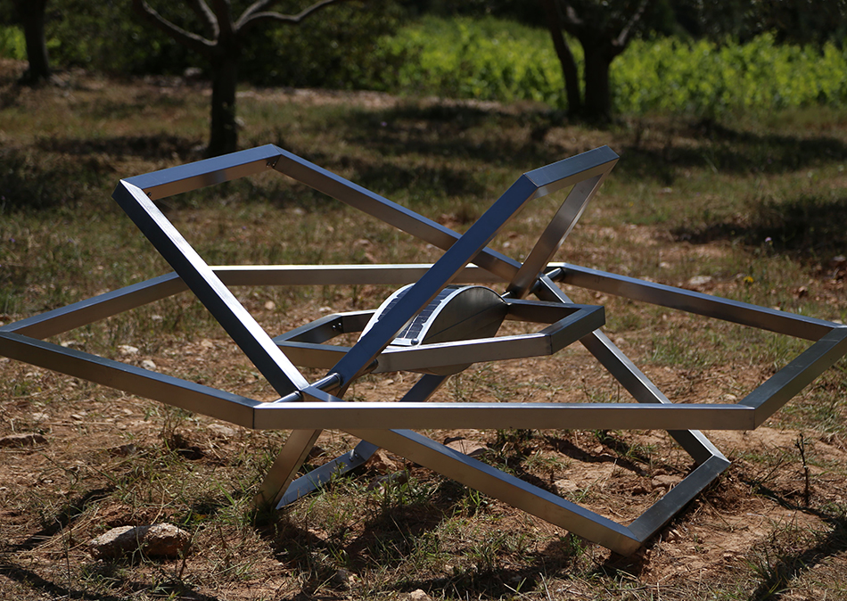 La sculpture Utopia réalisée en inox est à la fois modulaire et rotative, à mi-chemin entre un repère géodésique et un vaisseau spatial. Implantée dans le paysage, elle devient, grâce à sa fonction d’antenne, le vecteur d’une plate-forme virtuelle et se pose comme une interface entre territoire réel et territoire virtuel. Elle accueille en son “cœur” la technologie nécessaire à son déploiement. Autonome en énergie, elle émet dans le territoire son propre réseau wi-fi.
